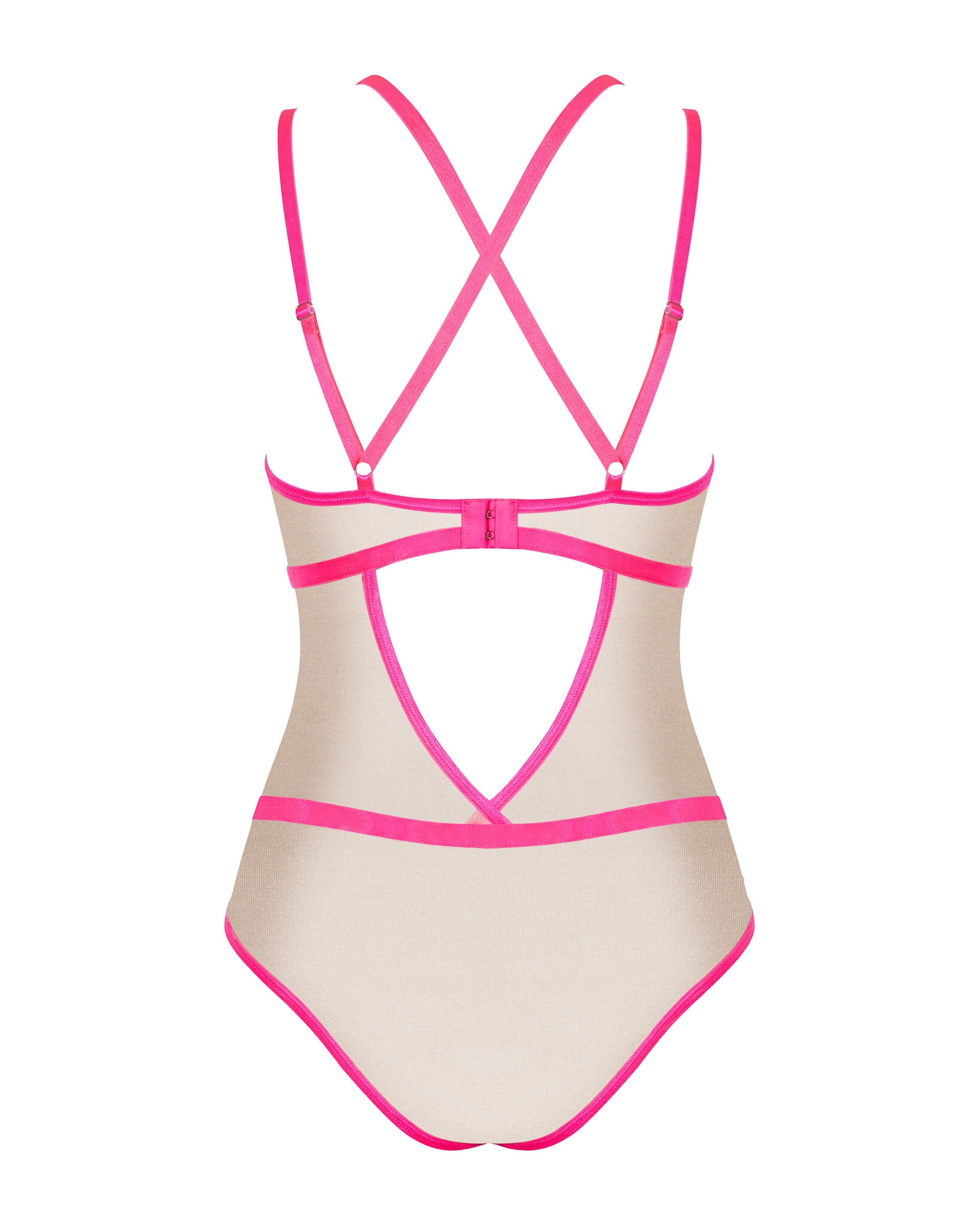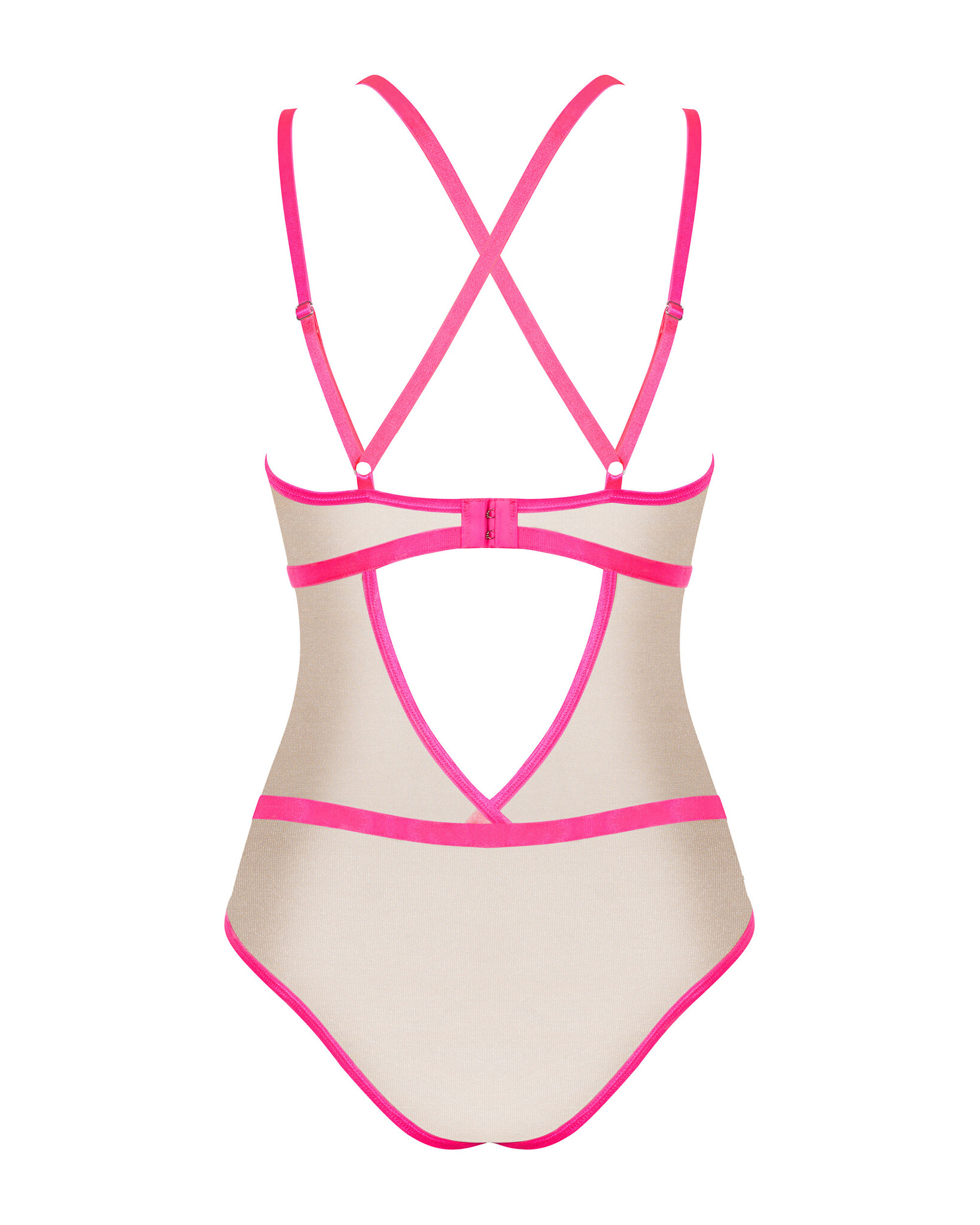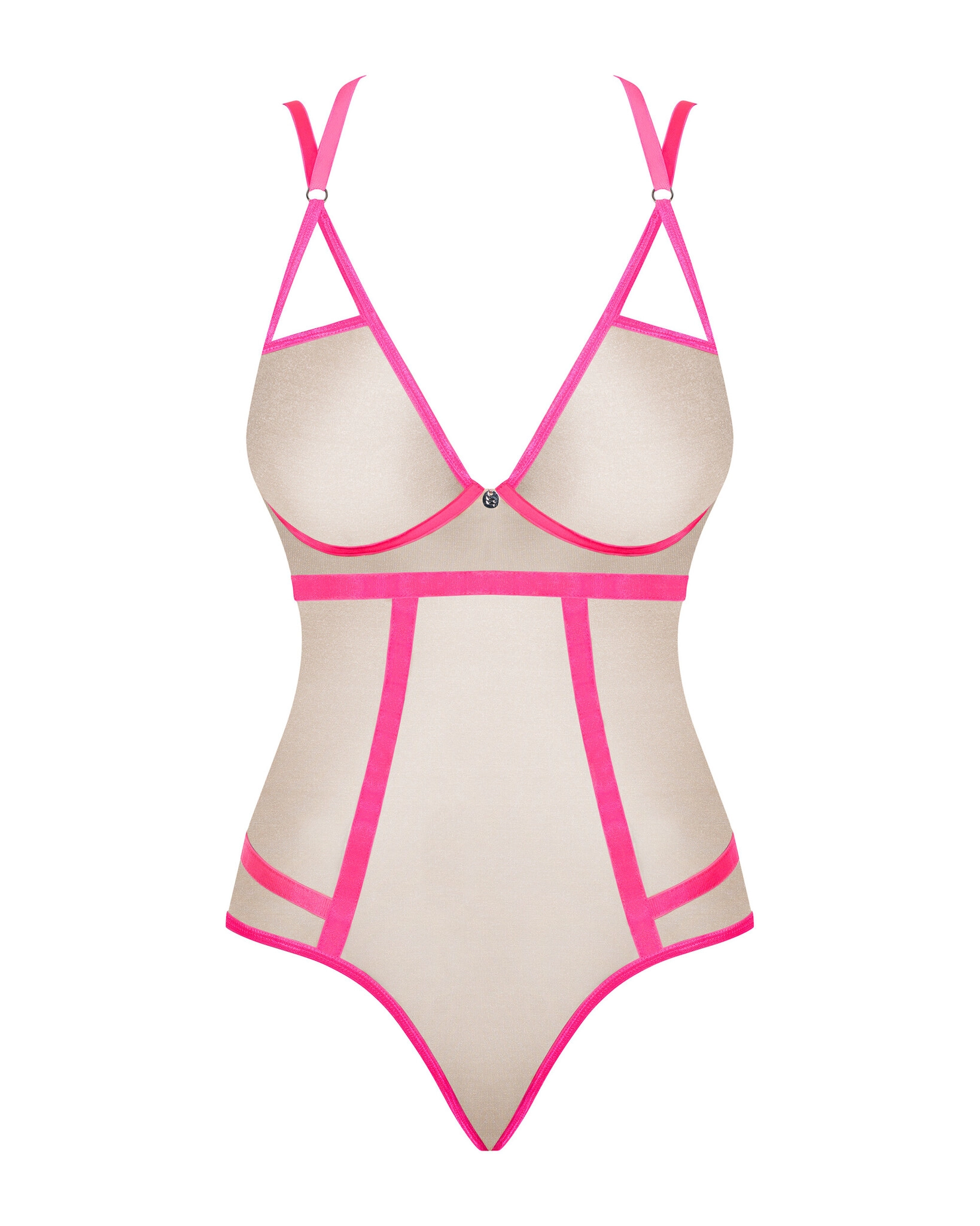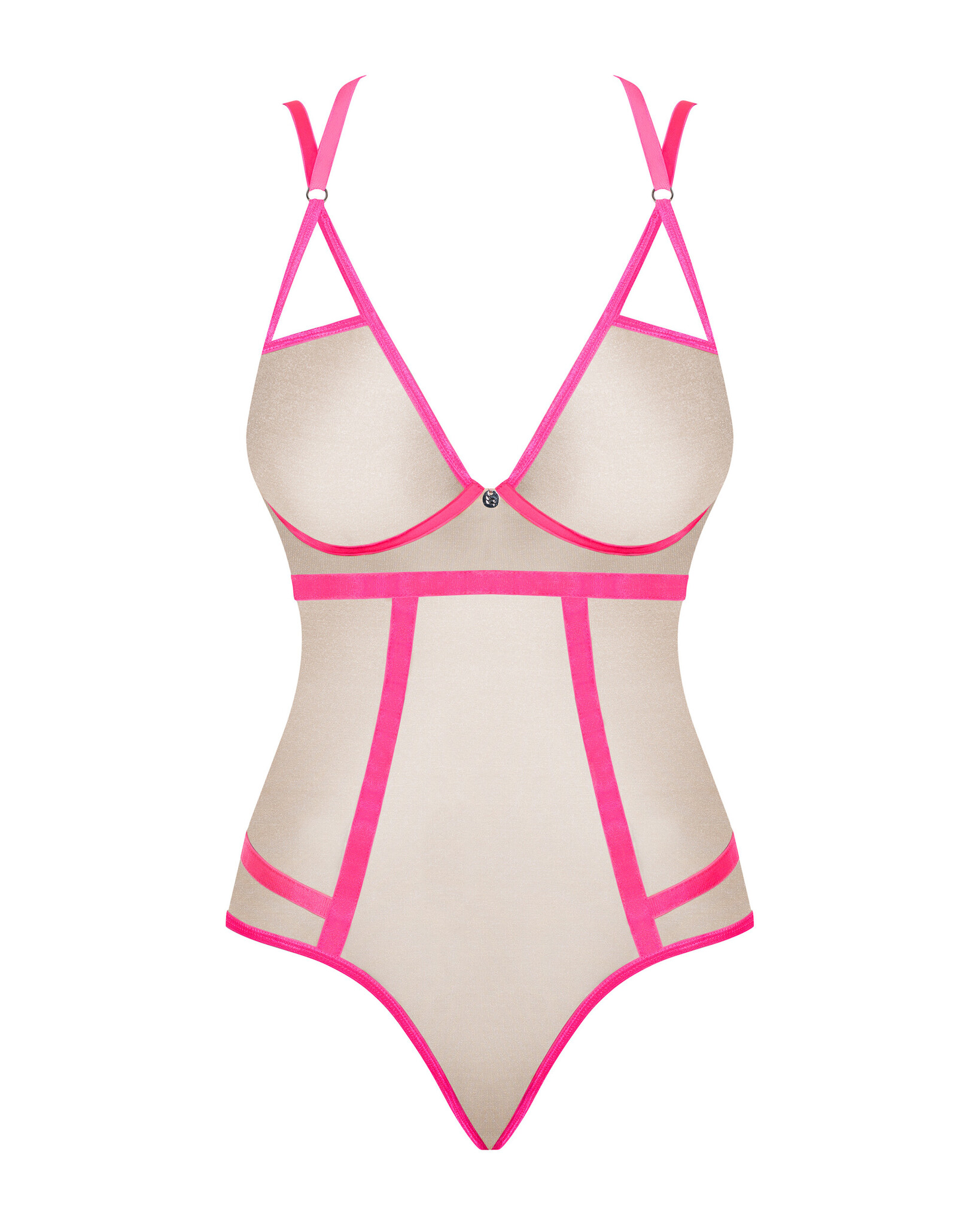 Изготовлено из полупрозрачной ткани телесного цвета с неоново-розовой окантовкой.